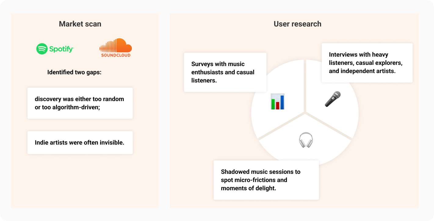 To ground our vision, I combined a market scan with user research. On the market side, we looked at Spotify and SoundCloud and saw the same pattern: discovery was either too random or too algorithm-driven, and indie artists were often invisible.